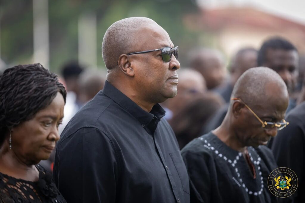 President John Dramani Mahama, alongside top government officials and party executives, on Saturday joined hundreds of mourners in Obuasi to