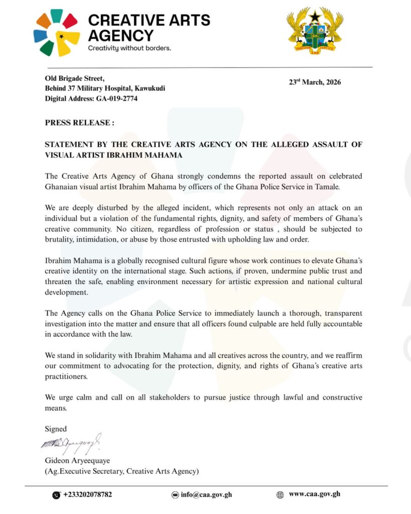 The Creative Arts Agency has strongly condemned the reported assault on prominent Ghanaian visual artist Ibrahim Mahama in Tamale, describing it as a serious breach of human rights and a threat to artistic freedom.