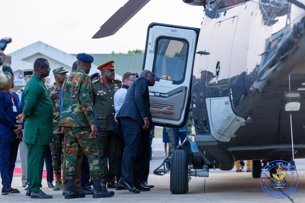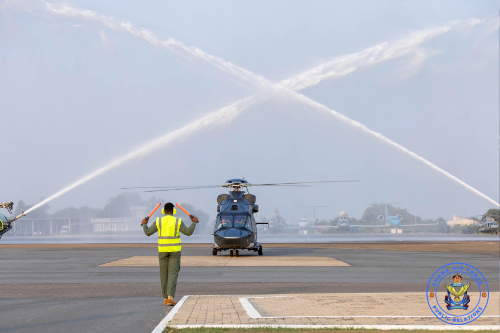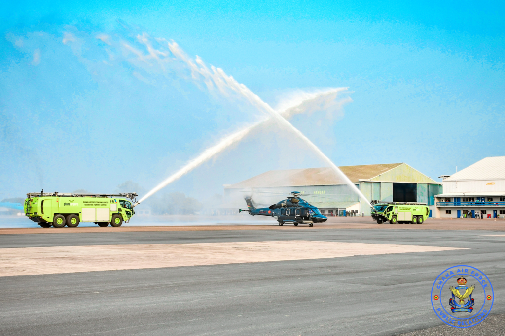 Upon arrival at the Air Force Base in Accra, the helicopter was given a water cannon salute — a ceremonial aviation tradition where airport fire trucks spray arcs of water over an aircraft, creating a tunnel as it taxis beneath.