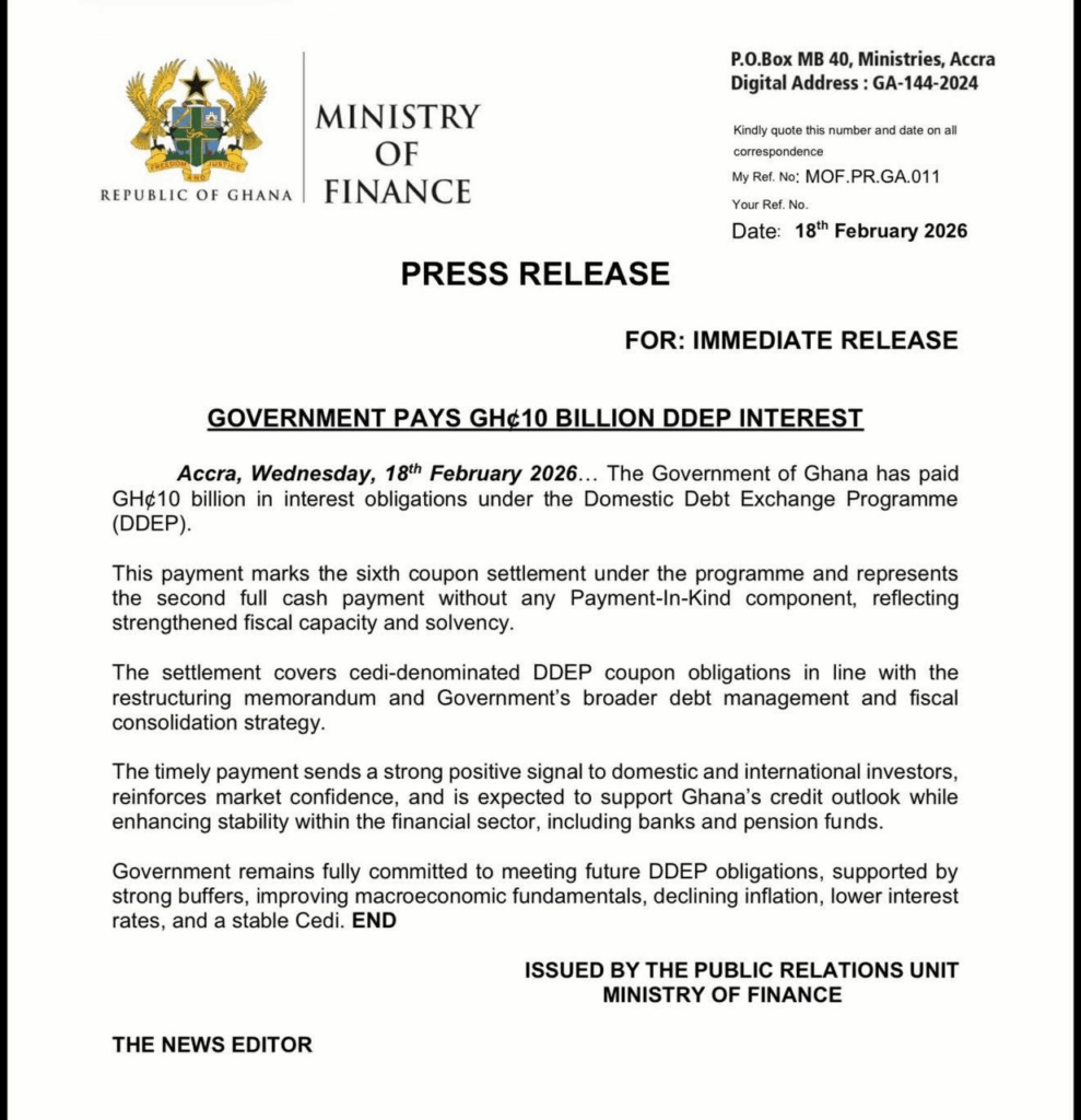 The full cash settlement covers cedi-denominated DDEP coupon obligations, in line with the restructuring memorandum and the Government’s broader debt management strategy.
