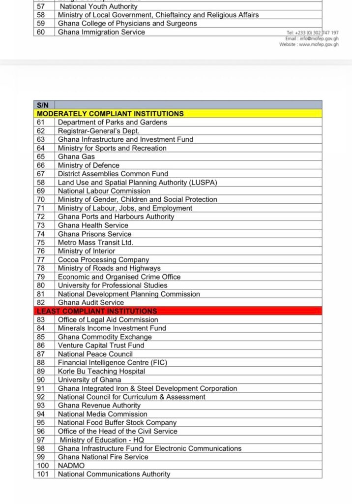 A total of 19 institutions were placed in the “Least Compliant” category after recording the lowest scores in the assessment. Among them are the Financial Intelligence Centre, the National Media Commission, the University of Ghana, the Ghana Commodity Exchange, and the National Food Buffer Stock Company.