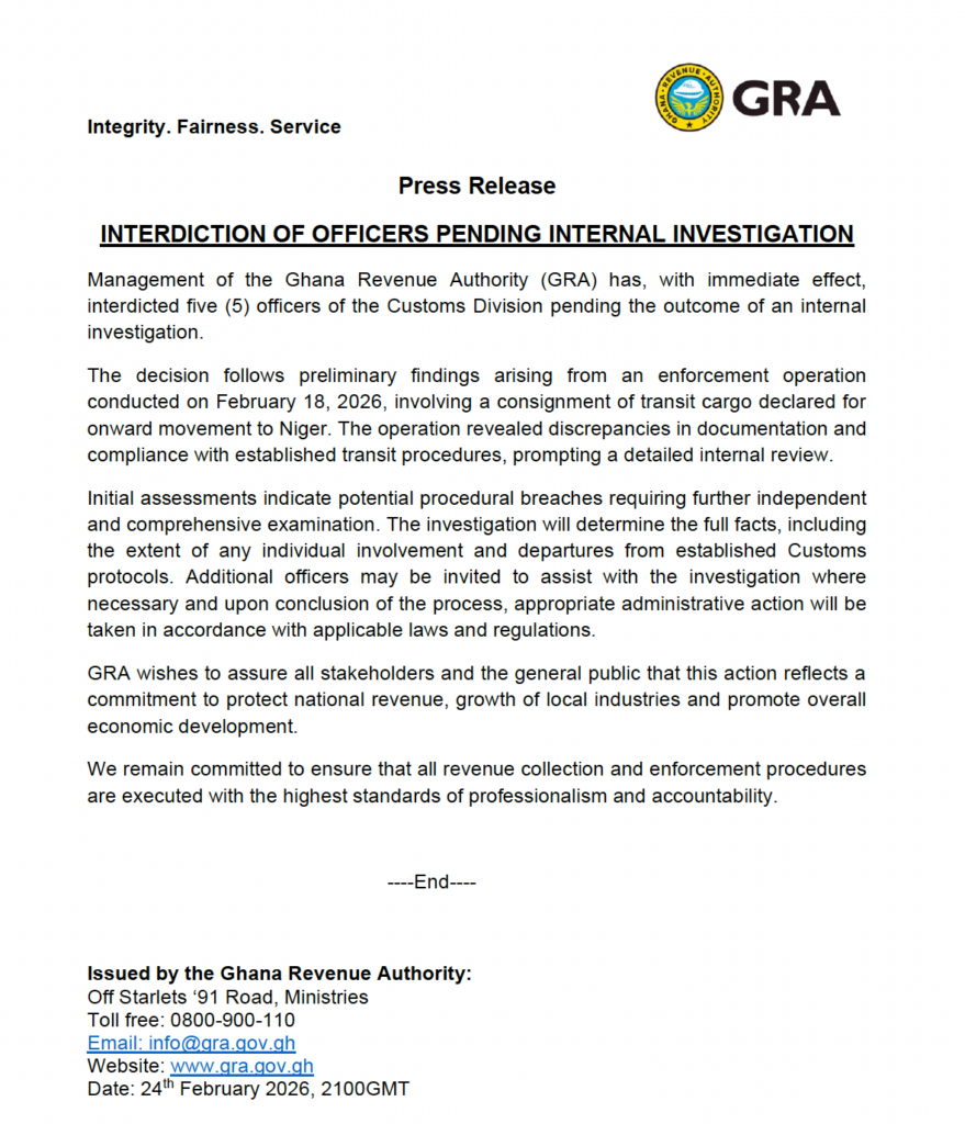“Management of the Ghana Revenue Authority (GRA) has, with immediate effect, interdicted five (5) officers of the Customs Division pending the outcome of an internal investigation,” the statement said.
