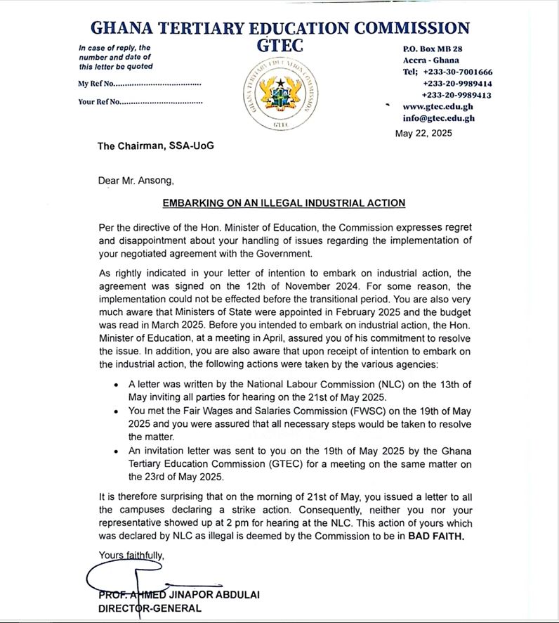 The Ghana Tertiary Education Commission (GTEC) has expressed disappointment over the decision by the Senior Staff Association of the University of Ghana to embark on an industrial strike, despite ongoing negotiations and scheduled engagements with relevant state agencies.