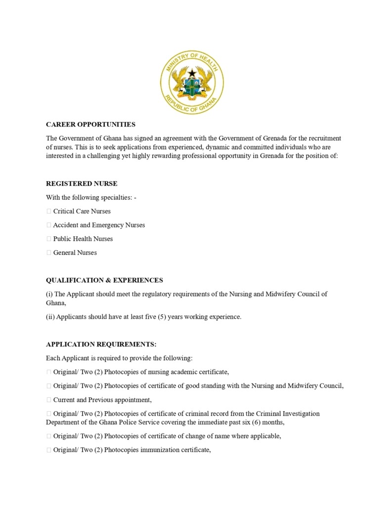 The Ministry of Health has announced the opening of applications for Ghanaian nurses to be recruited to work in Grenada, following a bilateral agreement between the Government of Ghana and the Government of Grenada.