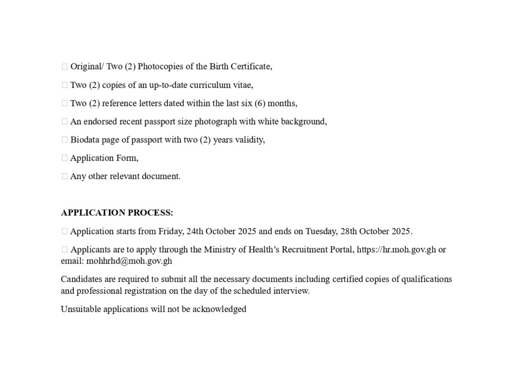 The application process begins on Friday, October 24, 2025, and closes on Tuesday, October 28, 2025. Interested candidates are to apply through the Ministry of Health’s online recruitment portal.