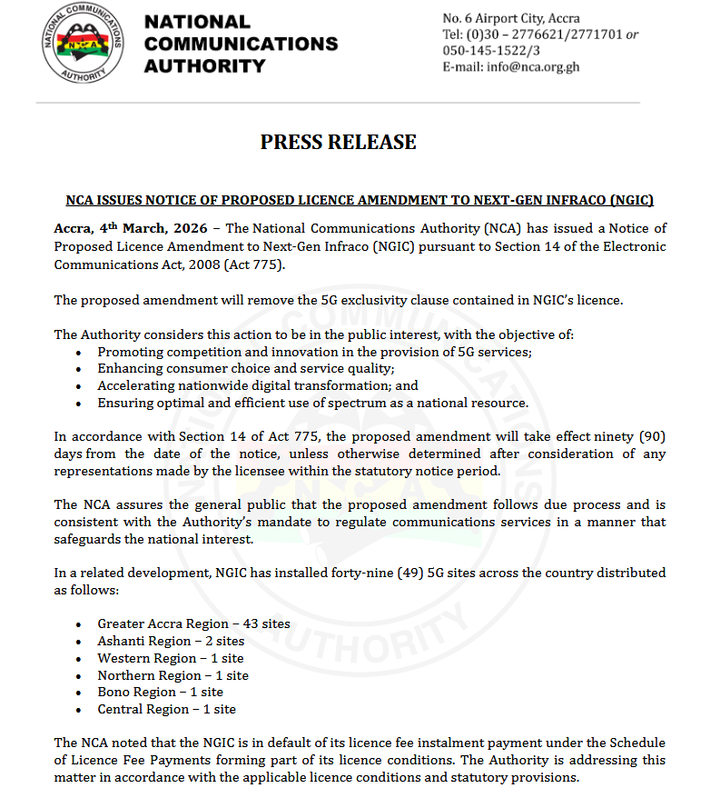 The National Communications Authority (NCA) has initiated the process to revoke the 5G exclusivity clause held by Next-Gen Infraco (NGIC).